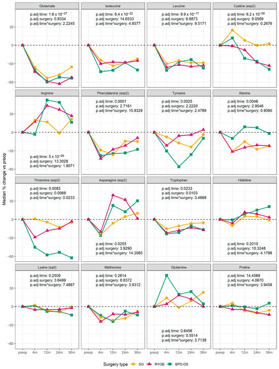Median changes in circulating amino acids by bariatric surgery type and by time point. The data are expressed as the median percent change versus the baseline. The p-values are the result of a mixed linear model fitted using individuals as random effect and time, surgery type and the interaction between time and surgery as fixed effects. The variables were transformed when needed to comply with the test assumptions. The p-values were adjusted using Bonferroni’s correction. Yellow circles: sleeve gastrectomy (SG); pink triangles: Roux-en-Y gastric bypass (RYGB); green squares: biliopancreatic diversion with duodenal switch (BPD-DS).