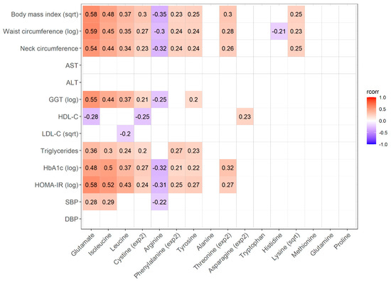Repeated-measure correlations between circulating amino acids and anthropometric/metabolic variable changes following bariatric surgery. Values are repeated-measure correlations (also called intra-individual correlations, rcorr [18]). Only significant results are shown based on Bonferroni-adjusted p-value of 0.05/16 (p = 0.003125). Variables were transformed when needed to comply with test assumptions. AST: aspartate aminotransferase; ALT: alanine aminotransferase; GGT: gamma-glutamyl transferase; HDL-C: high-density lipoprotein cholesterol; LDL-C: low-density lipoprotein cholesterol; HbA1c: glycated hemoglobin; HOMA-IR: homeostatic model assessment of insulin resistance; SBP: systolic blood pressure; DBP: diastolic blood pressure.