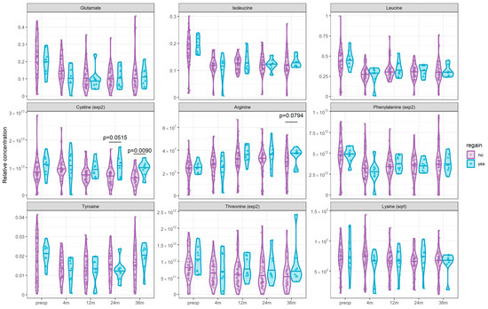 Comparison of circulating amino acids between patients who regained weight after bariatric surgery and those who did not. We defined weight regain as weight gain of more than 10 kg after reaching nadir (lowest weight). Blue triangles and violin plots represent patients who regained weight after nadir (n = 9) and purple circles and violin plots represent patients who maintained their weight loss (n = 54). Violin plots show distribution of circulating amino acids, middle lines correspond to median and triangles/circles are individual observations. Groups were compared using a two-tailed t-test. p-values were not adjusted since statistical power was already limited by unequal group sizes, and therefore, they need to be interpreted with caution. p values below 0.1 are shown.