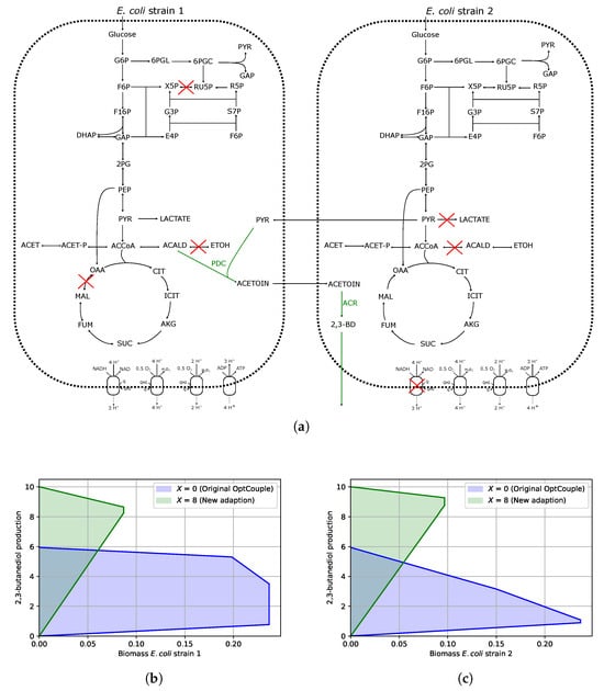 Overview of the strategy identified with the adapted OptCouple for finding growth couples of 2,3-butanediol in community cohorts in two E. coli strains. (a) Metabolic network demonstrating the predicted design for coupling 2,3-BD to community growth. (b,c) Production envelopes showing the minimum and maximum 2,3-BD production rate (mmol · ) as the biomass is increased in each strain. The green shaded regions are the results from our new adapted OptCouple, whereas the blue shaded regions are the results when running the original OptCouple on the community model. Red crosses indicate the reactions knocked out by our algorithm.