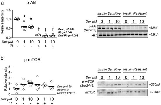 Effect of dexamethasone on insulin sensitivity. (a,b) Effect of dexamethasone (Dex) at 0 µM, 1 µM, or 10 µM or DMSO control (0.1%) for 24 h under insulin-sensitive or insulin-resistant (IR) conditions on (a) p-Akt and (b) p-mTOR activation following insulin stimulation for 30 min. Notes: Two-way ANOVA with Bonferroni’s corrections was used to analyze data. p values presented for main effects are listed for each outcome. * Indicates p < 0.05 between Dex versus its true control within each level of insulin sensitivity. † Indicates p < 0.05 between levels of insulin resistance within similar Dex concentrations. Data are from two replicate wells from two independent experiments (n = 4).