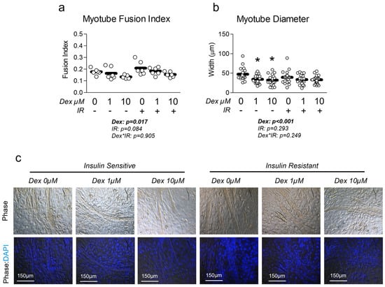 Effect of dexamethasone and insulin resistance on myotube fusion and diameter. (a,b) Effect of dexamethasone (Dex) at 0 µM, 1 µM, or 10 µM or DMSO control (0.1%) for 24 h under insulin-sensitive or insulin-resistant (IR) conditions on (a) myotube fusion index and (b) myotube diameter. Notes: Two-way ANOVA with Bonferroni’s corrections was used to analyze data. p values presented for main effects are listed for each outcome. * Indicates p < 0.05 between Dex versus its true control within each level of insulin sensitivity. No differences were observed between levels of insulin resistance within similar Dex concentrations. Myotube fusion was calculated from three replicate wells from two independent experiments (n = 6) and was quantified by a blinded member of the research team with representative images of phase and DAPI-phase overlay depicted in panel (c). One value within the insulin-sensitive Dex 10 µM group was removed from the final analysis as a significant outlier (p < 0.05, Grubb’s outlier test). Myotube diameter was calculated using images from three replicate wells from two independent experiments, with individual myotubes assessed for diameter by a blinded member of the research team (n = 17–24 myotubes per group).