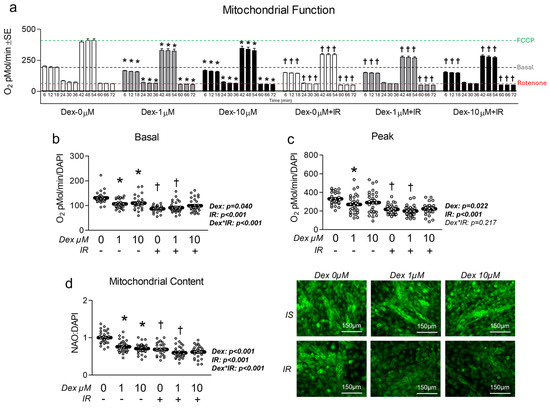 Effect of dexamethasone on mitochondrial function. (a) MitoStress assay following treatment with dexamethasone (Dex) at 0 µM, 1 µM, or 10 µM or DMSO control (0.1%) for 24 h under insulin-sensitive or insulin-resistant (IR) conditions. (b,c) Effect of Dex on basal (b) and peak (c) mitochondrial metabolism following normalization to cell nuclei content (presented in Figure S2). (d) Mitochondrial content (NAO staining) of cells treated as described in “a” following normalization to cell nuclei content (presented in Figure S2). Notes: Panel “a” was analyzed using factorial ANOVA with time as a repeated measures factor and Bonferroni’s correction for multiple comparisons. Two-way ANOVA with Bonferroni’s corrections was used to analyze data. p values presented for main effects are listed for each outcome. * Indicates p < 0.05 between Dex versus its true control within each level of insulin sensitivity. † Indicates p < 0.05 between levels of insulin resistance within similar Dex concentrations. Images presented in panel “d” were captured using the 20× objective. Data are from 15 to 16 replicate wells from two independent experiments (n = 30–32).