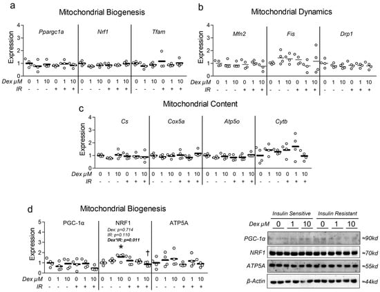 Given the association between insulin resistance and reduced mitochondrial function, we assessed the effect of Dex in the presence and absence of insulin resistance on myotube mitochondrial function. Congruent with this idea, cells treated with Dex and/or insulin resistance exhibited significantly reduced oxygen consumption in a dose-dependent manner (Figure 3a), indicating reduced mitochondrial function. Moreover, following removal of non-mitochondrial respiration and normalization to nuclei content, basal mitochondrial oxygen consumption was significantly reduced by both Dex and insulin resistance, which is suggestive of reduced basal mitochondrial respiration (Figure 3b). Interestingly, insulin-resistant cells treated with 1 µM Dex displayed a further reduction in basal mitochondrial oxygen consumption than insulin-sensitive cells treated with 1 µM Dex (Figure 3b), which may suggest an additive effect of insulin resistance when coupled with dexamethasone-induced myotube atrophy (interaction effect p < 0.001). Peak mitochondrial oxygen consumption was also significantly reduced following either Dex treatment or insulin resistance independently, however, no additive effect was observed when the two treatments were coupled (Figure 3c). To determine if mitochondrial content was altered in proportion to mitochondrial function, we compared mitochondrial staining between groups and again found both Dex and insulin resistance independently reduced mitochondrial content, and that insulin-resistant cells treated with 1 µM Dex displayed a further reduction in mitochondrial content than insulin-sensitive cells treated with 1 µM Dex (Figure 3d). Collectively, these observations demonstrate that each treatment condition is sufficient to reduce myotube mitochondrial function and content. It is, however, noteworthy that there was no difference between the insulin-resistant cells treated with 10 µM Dex versus the insulin-resistant-only control or the insulin-sensitive cells treated with 10 µM Dex for any of the assessed mitochondrial function or content experiments. This may imply that the 10 µM is sufficient to diminish mitochondrial function to a baseline level. To explore the potential mechanisms of Dex and insulin resistance-mediated reductions in mitochondrial function/content, we explored gene and protein expression of molecular targets that govern mitochondrial content and observed no major effect of either treatment condition on molecular regulators of mitochondrial biogenesis or dynamics (Figure 4). Because we did not observe any consistent changes in mitochondrial biogenesis or dynamics, we also assessed the effects of each treatment on the expression of Parkin at the mRNA and protein levels. Again, no significant changes between groups were observed (Figure S6).
