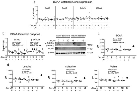 Effect of dexamethasone on branched-chain amino acid metabolism. (a) Effect of treatment with dexamethasone (Dex) at 0 µM, 1 µM, or 10 µM or DMSO control (0.1%) for 24 h under insulin-sensitive or insulin-resistant (IR) conditions on BCAA catabolic enzyme mRNA expression signaling. (b) Effect of treatment as described in “a” on BCAA catabolic enzyme protein expression signaling. (c,d) Effect of treatment as described in “a” on extracellular (c) total BCAA and (d) individual BCAA content. Notes: Two-way ANOVA with Bonferroni’s corrections was used to analyze data. p values presented for main effects are listed for each outcome when significant main/interaction effects were observed. Gene expression results revealed no significant effects. * Indicates p < 0.05 between Dex versus its true control within each level of insulin sensitivity. † Indicates p < 0.05 between levels of insulin resistance within similar Dex concentrations. mRNA and protein expression data are from two replicate wells from two independent experiments (n = 4). Media BCAA content was from four replicate wells from two independent experiments (n = 7–8). The dark diamond labeled “M” within panels (c,d) denotes stock media BCAA composition. One value within the insulin-sensitive control group was removed from the final analysis as a result of being a significant outlier (p < 0.05, Grubb’s outlier test).