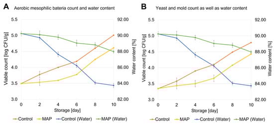 Plot of the average viable counts and standard deviations [log CFU/g] in relation to the water content and storage period from day 0 to day 10 of the aerobic mesophilic bacteria count (A) and the yeast and mold count (B). The viable counts of the control are shown in orange, and the ones of the MAP storage are shown in yellow; while the water content of the control storage is shown in blue, and the water content of the MAP storage is shown in green.