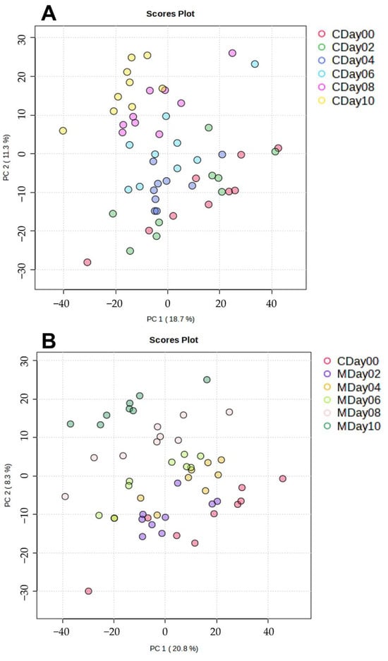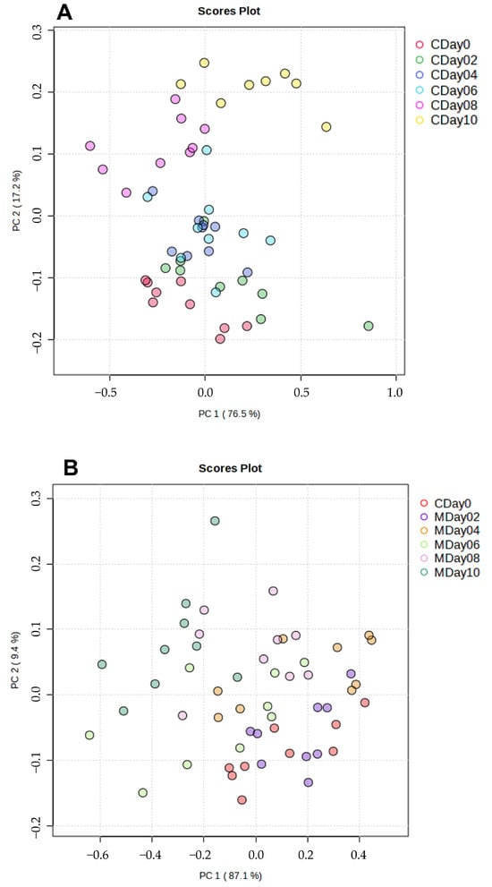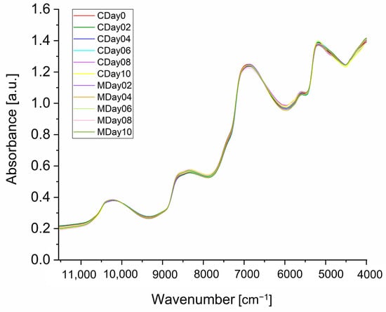 Analysis of the score plot (total variance 93.7%) of the control storage (Figure 3A) showed clear clusters according to the storage days. The samples from day 0 exhibit a negative correlation with PC2, while samples with increasing storage time show an increasingly positive correlation with PC2. It can be observed that samples from day 0 to day 6 are located in the negative range of PC2, whereas the samples from day 8 and day 10 cluster in the positive range of PC2. A similar result is seen in the score plot of the MAP storage (Figure 3B), which shows an overall variance of 96.5%. The score plot demonstrates that the samples from day 0 and day 2 cluster in the positive range of PC1, while the samples with increasing storage time (day 4 to day 10) show a distribution in the negative direction of PC1. The score plot of both conditions (Figure S1A, Supplementary Materials) illustrates that the samples from day 0 to day 6 of both storage conditions cluster in the negative range of PC2, while the samples from day 8 and day 10 cluster in the positive range. It can be observed that the samples cluster in the positive range of PC2 with increasing storage time. Furthermore, the score plot indicates that the control samples are further away from the samples of day 0 with increasing storage time (day 8 to day 10) than with storage under MAP. In summary, the PCA analysis of the FT-NIR spectroscopy analysis shows that the two storage conditions correlate with the storage time. Additionally, the score plot in Figure S1A shows differences between the two storage conditions.