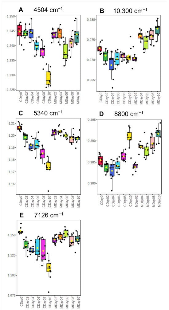Boxplots of the most important selected wavenumbers recorded by FT-NIR and selected by ANOVA. Shown are the normalized signal intensities of the control samples (C) and the MAP samples (M) during the storage period of day 0 to day 10. (A) presents the boxplots of the signal intensities of the selected wavenumber 4504 cm−1 associated with carbohydrates, while (B) shows the boxplots of the signal intensities of the selected wavenumber 10.300 cm−1. (C) shows the boxplots of the signal intensities of the selected wavenumber 5340 cm−1, which is also associated with water content. (D) presents the boxplots of the signal intensities of the selected wavenumber 8800 cm−1, which is associated with lipids and (E) shows the boxplots of the signal intensities of the selected wavenumber 7126 cm−1, which is associated with proteins and carbohydrates.