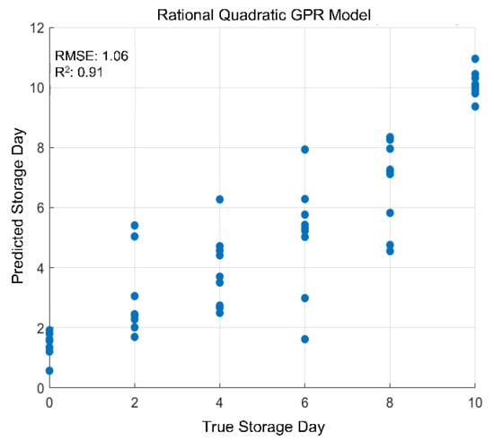 Linear regression model (Rational Quadratic GPR) of the strawberry samples stored in control storage to predict the storage day of the strawberry samples stored in MAP film. The blue dots show the prediction of the storage days depending on the actual storage day of the individual samples stored under MAP conditions.