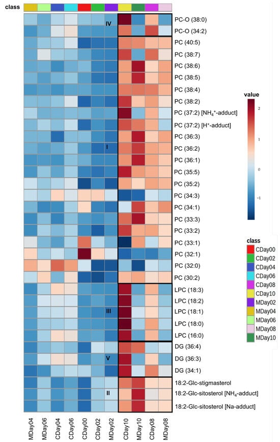 Results of the relation analysis of the identified metabolites. A hierarchical cluster analysis using Euclidean distances and the average was applied to the normalized and auto-scaled peak intensities. The intensity of the coloring indicates the peak intensity of the identified metabolite between the respective storage day and storage condition. The clusters are labeled with I–V and were assigned to: (I) identified PCs, (II) identified sterols, (III) identified LPCs, (IV) identified PC-Os, and (V) identified DGs.