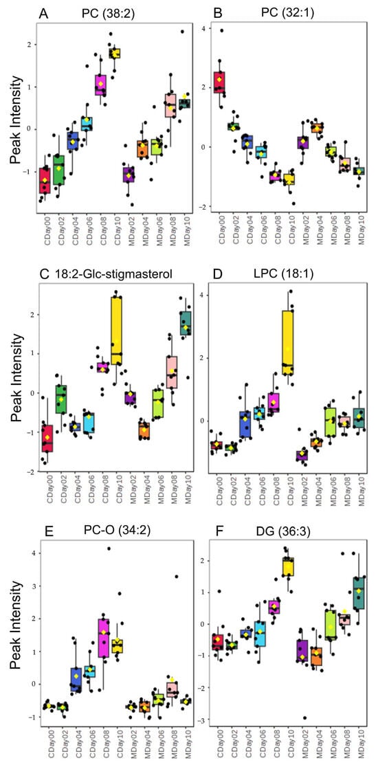 The analysis of cluster II in Figure 7, which shows the identified sterols, reveals that they have high-intensity peaks on the eighth and tenth days of both storage periods. It can be observed that the sterols are synthesized with increasing storage time (Figure 8C). The synthesis of these sterols can be influenced by stress factors such as low temperatures. Indeed, an increase in both sitosterol and stigmasterol was observed in studies on apple and tomato storage [,].
