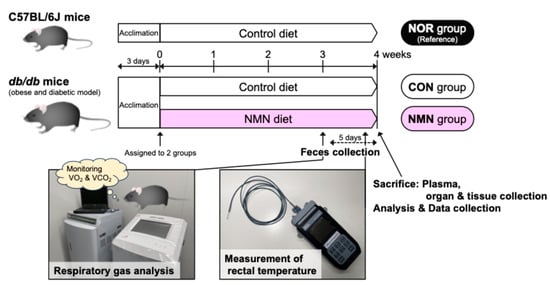 Shirouchi, B.; Mitsuta, S.; Higuchi, M.; Okumura, M.; Tanaka, K. Dietary Nicotinamide Mononucleotide, a Key NAD+ Intermediate, Alleviates Body Fat Mass and Hypertriglyceridemia by Enhancing Energy Expenditure with Promotion of Fat Oxidation and Hepatic Lipolysis and Suppressing Hepatic Lipogenesis in db/db Mice. Metabolites 2025, 15, 333. https://doi.org/10.3390/metabo15050333