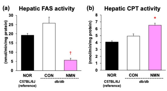 3.4. Effects of Dietary NMN Intake on Activities of Hepatic Enzymes Related to Fatty Acid Metabolism in Obese Diabetic db/db Mice