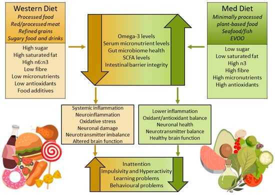 Poor-quality diets and their components are also linked to ADHD. Children in the top quintile for a Western dietary pattern were more likely to have ADHD compared to those in the lowest quintile, while a healthy dietary pattern was inversely associated with ADHD [135]. In similar studies of children [136] and adolescents [126], a Western dietary pattern was positively associated with ADHD diagnosis; however, there was no association between ADHD diagnosis and a “healthy” dietary pattern among adolescents [126]. ADHD diagnosis has also been associated with higher intake of saturated fat [137], lower adherence to a MedDiet (discussed in Section 2.4), and higher intake of ultra-processed foods and SSBs in children [138] and in both children and adolescents [139,140,141]. Children and adolescents in the highest quartile of adherence to a combined Mediterranean and Dietary Approaches to Stop Hypertension (DASH) diet were found to have significantly lower odds of developing ADHD compared to those in the lowest quartile [142]. Additionally, a recent systematic review and meta-analysis showed that, whilst poor diet quality is linked with an increased risk of ADHD in both children and adults, a dietary pattern rich in fruits, vegetables, and fish may protect against ADHD [57].