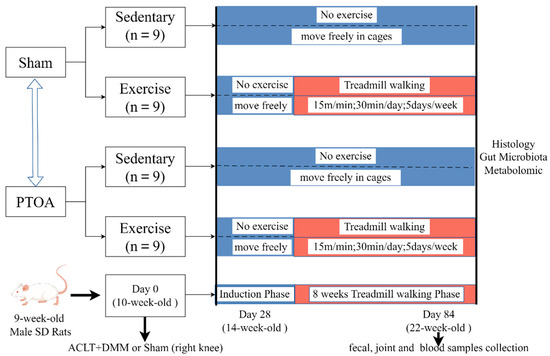 - Hao, X.; Zhang, J.; Shang, X.; Sun, K.; Zhou, J.; Liu, J.; Chi, R.; Xu, T. Exercise modifies the disease-relevant gut microbial shifts in post-traumatic osteoarthritis rats. Bone Jt. Res. 2022, 11, 214–225. [Google Scholar] [CrossRef] [PubMed]
