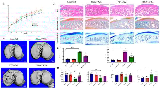 - Glasson, S.S.; Chambers, M.G.; Van Den Berg, W.B.; Little, C.B. The OARSI histopathology initiative—Recommendations for histological assessments of osteoarthritis in the mouse. Osteoarthr. Cartil. 2010, 18 (Suppl. 3), S17–S23. [Google Scholar] [CrossRef]