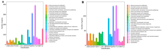 KOG annotation of differentially expressed genes in gill (A) and liver (B).