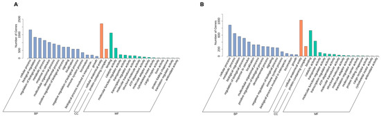 The GO enrichment analysis of differentially expressed genes (DEGs) in gill and liver tissues revealed distinct functional categorization across three major ontologies: biological process [BP], cellular component [CC], and molecular function [MF] (Tables S4 and S5). The top 15 enriched terms are illustrated in Figure 4. In gill tissues, the most prominently enriched BPs included cellular mechanisms, the regulation of biological processes, metabolic processes, and response to stimuli. Significant enrichment was observed for the protein-containing complex and the cellular anatomical entity in the CC category, whereas binding, catalytic activity, molecular function, regulator activity, and transporter activity were the largest MF subcategories (Figure 4A, Table S6). In liver tissues, the GO annotation classifications of the DEGs were similar to those of the gill tissues with lower gene numbers (Figure 4B, Table S7).
