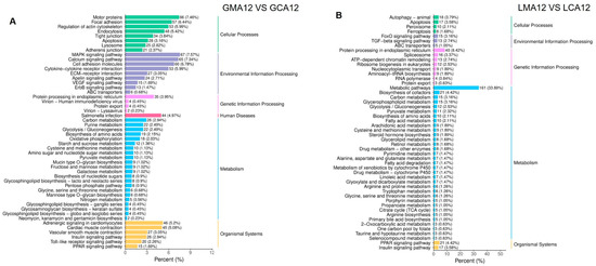 The 50 most significantly enriched pathways were selected to generate the KEGG enrichment column chart. Details of the number of DEGs annotated against the KEGG database and their ratio to the total number of DEGs are shown in Figure 5A,B. In the gill tissues, the dominant DEGs were annotated to pathways related to cellular processes (332 genes), environmental information processing (330 genes), metabolism (231 genes), and organismal systems (179 genes). In contrast, in liver tissues, the number of DEGs associated with metabolic pathways was up to 410, followed by genetic information processing (106), cellular processes (53 genes), organismal systems (38 genes), and environmental information processing (33 genes).