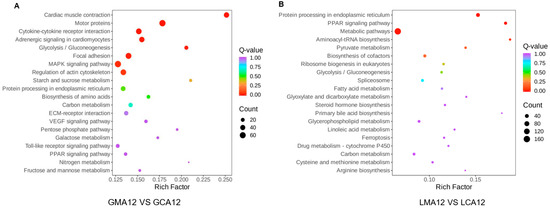 The 20 most significantly enriched pathways were selected to generate the bubble map of KEGG enrichment analysis (Figure 6). The detailed information, including description, gene ratio, and the number of upregulated and downregulated genes, is shown in Tables S8 and S9. In gill samples, the DEGs exhibited significant enrichment in several key biological pathways, including cardiac muscle contraction, motor protein activity, adrenergic signaling in cardiomyocytes, glycolysis/gluconeogenesis, MAPK signaling, actin cytoskeleton regulation, cytokine–cytokine receptor interaction, and toll-like receptor signaling (Figure 6A). In liver tissues, the DEGs demonstrated significant enrichment in fundamental biological processes, particularly those associated with metabolic regulation and biosynthetic mechanisms. As illustrated in Figure 6B, the most prominently enriched pathways were associated with protein processing in the endoplasmic reticulum, PPAR signaling, metabolism, aminoacyl–tRNA biosynthesis, pyruvate metabolism, cofactor biosynthesis, ribosome biogenesis in eukaryotes, glycolysis/gluconeogenesis, spliceosome function, fatty acid metabolism, steroid hormone biosynthesis, primary bile acid biosynthesis, and linoleic acid metabolism, among others.