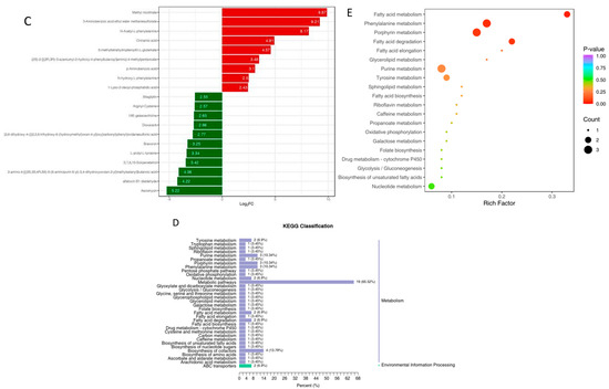 Compared to the control samples, 130 serum metabolites were significantly upregulated (p < 0.05), and 167 were significantly downregulated (p < 0.05) in the MA bass samples (Figure 8A). Details of differential metabolites are illustrated in Table S11.