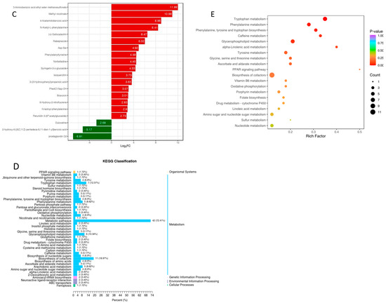 The KEGG annotation results in the liver tissues are similar to those in the gill samples, indicating that most of the differential metabolites are involved in metabolism, as shown in Figure 8D. The KEGG signal pathway enrichment analysis of the different metabolites between the two groups revealed that the differential metabolites were mainly involved in the metabolism of tryptophan, phenylalanine, phenylalanine, caffeine, glycerophospholipids, alpha-linolenic acid, tyrosine, glycine, serine–threonine, ascorbate and aldarate, vitamin B6, porphyrin, linoleic acid, amino and nucleotide sugars, sulfur, and nucleotides, as well as tyrosine and tryptophan biosynthesis, PPAR signaling, cofactor biosynthesis, oxidative phosphorylation, folate biosynthesis, and drug metabolism through cytochrome P450 expression (Figure 8E).