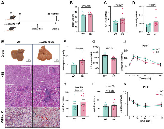 Marion et al. reported enlarged LDs in 9-month-old Hsd17b13 KO mice [32]. To investigate the long-term consequences of HSD17B13 deficiency, we established an aged mouse model by maintaining wild-type (WT) and Hsd17b13 KO mice on standard chow for 22 months (Figure 1A). Although there was no difference in their body weight (Figure 1B), the Hsd17b13 KO mice had an increased liver weight (Figure 1C) and a trend toward an increased liver weight-to-body weight ratio (Figure 1D). We then performed a histopathological evaluation of the livers of the WT and Hsd17b13 KO mice. In parallel with Marion’s observation, H&E staining revealed heightened inflammatory infiltration in the Hsd17b13 KO mice (Figure 1E). Utilizing Oil Red O staining, we observed a notable trend toward an increased average size and a decreased number of LDs in the liver of the Hsd17b13 KO mice (Figure 1F,G), which was not accompanied by a significantly increased hepatic deposition of neutral lipids (TGs and TCs) (Figure 1H,I). We also investigated glucose metabolism by conducting GTTs and ITTs on both groups of mice. There was no notable difference in the glucose tolerance and insulin sensitivity between the two studied groups (Figure 1J,K). Our data indicate that an HSD17B13 deficiency in mice is accompanied by the development of aging-related hepatitis, without affecting glucose metabolism.