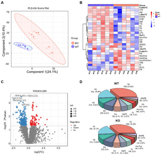 Lipidomic profiling reveals altered lipid metabolism in the Hsd17b13 KO mice. (A) The partial least squares-discriminant analysis (PLS-DA) score plot presents the lipidomic data derived from the WT and Hsd17b13 KO mice. (B) Heatmap showing the relative abundances of differently lipid subclasses between the WT and Hsd17b13 KO mice. (C) Volcano plot visualizing the changes in the lipid profiles between the WT and Hsd17b13 KO mice. (D) Pie charts representing the distribution of lipid categories in both the WT and Hsd17b13 KO mice. Bis-methylphosphatidylethanolamine (BisMePE); lysophosphatidylethanolamine (LPE); stigmasteryl ester (StE); lysodimethylphosphatidylethanolamine (LdMePE); sulfoquinovosyldiacylglycerol (SQDG); carnitine ester (CmE); zymosterol ester (ZyE); triglyceride (TG); cardiolipin (CL); phosphatidylethanolamine (PE); phosphatidylcholine (PC); lyso-phosphatidylcholine (LPC); methylphosphatidylcholine (MePC); monohexosylceramide (Hex1Cer); ceramide (Cer); sphingomyelin (SM); monogalactosyldiacylglycerol (MGDG); diglyceride (DG); dimethylphosphatidylethanolamine (dMePE); bis-methylphosphatidic acid (BisMePA); phosphatidylglycerol (PG); trihexosylceramide (Hex3Cer); dihexosylceramide (Hex2Cer); ceramide trihexoside-N-acetylglucosamine (CerG3GNAc1); cholesteryl ester (ChE); phosphatidylinositol (PI); dilyso-cardiolipin (DLCL); phosphatidylserine (PS). (WT: n = 6; KO: n = 6 biologically independent animals.)