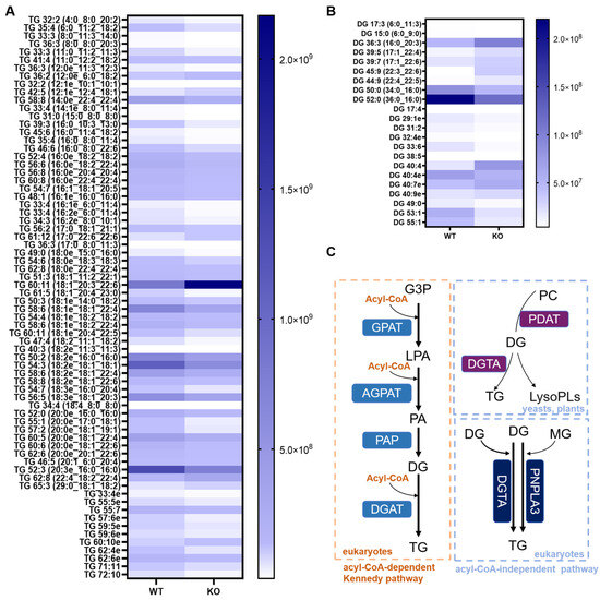 Considering the importance of triacylglycerols in lipid metabolism in hepatocytes, we carried out comprehensive omics sequencing targeting TGs; then, we performed a heatmap analysis on the obtained sequencing data. The heatmap analysis visually presented the data, showing that TG 18:1_20:3_22:6 was the most clearly upregulated (Figure 3A). The top three most upregulated DGs were DG 22:3_22:6, DG 40:4, and DG 22:4_22:5 (Figure 3B). In eukaryotes, the acyl-CoA-dependent Kennedy pathway involves three sequential acylation reactions of glycerol-3-phosphate. Through a series of acylation reactions, glycerol-3-phosphate is sequentially converted to lysophosphatidic acid, phosphatidic acid, and then diacylglycerol. Finally, DG is acylated with a third fatty acyl-CoA molecule by diacylglycerol acyltransferase (DGAT), forming TG, which can be stored for energy or used in other cellular processes. In addition, another TG synthesis pathway is the acyl-CoA-independent pathway, which is mediated by acyl-CoA-independent diacylglycerol transacylase (DGTA) and patatin-like phospholipase domain-containing protein 3 (PNPLA3) separately [33,34]. These enzymes transfer a fatty acyl moiety from a phospholipid (such as PC) to DG to form TG in yeasts and vascular plants (Figure 3C) [35].