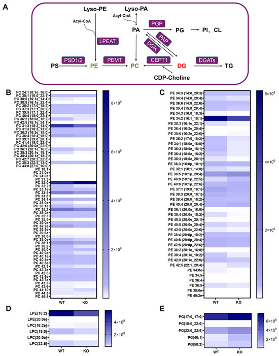 Altered phospholipid metabolism landscape in the Hsd17b13 KO mice. (A) An illustrative diagram depicting various lipid metabolic pathways and their interconversion processes. A heatmap showing the differences in (B) PC, (C) PE, (D) LPE, LPC, and (E) PG levels between the WT and Hsd17b13 KO mice. Lysophosphatidylethanolamine (Lyso-PE); acyl-coenzyme A (Acyl-CoA); lysophosphatidic acid (Lyso-PA); phosphatidic acid (PA); phosphatidylinositol (PI); cytidine diphosphate-choline (CDP-choline); phosphatidylserine decarboxylase 1/2 (PSD1/2); phosphatidylethanolamine N-methyltransferase (PEMT); lysophosphatidylethanolamine acyltransferase (LPEAT); choline/ethanolamine phosphotransferase 1 (CEPT1); phosphatidylglycerophosphate (PGP); phosphatidic acid phosphatase (PAP); diacylglycerol kinase (DGK).