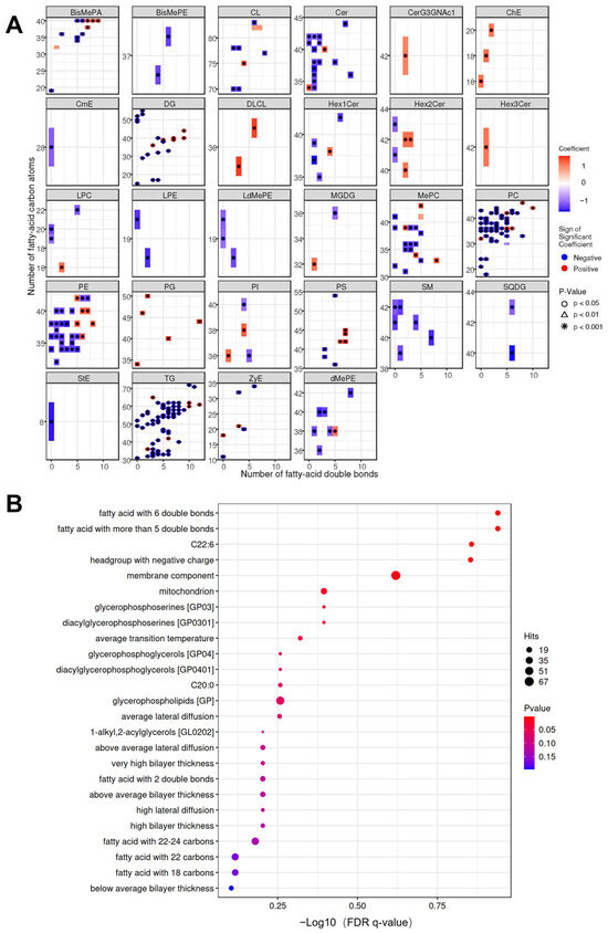 For an in-depth lipidomic analysis, the structural features of the differentially identified lipids were analyzed using the lipidomoR package (version 0.1.2). A functional enrichment analysis of lipids from distinct communities was carried out using the LION package (version 0.1.0) [30,31].