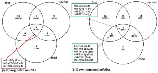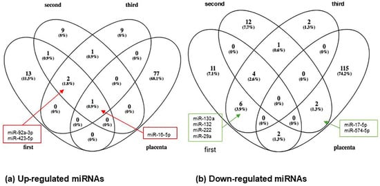 Comparative Venn diagram. Clustering of circulating miRs and placental miRs determined in women with gestational diabetes mellitus. (a) In the up-regulated miRNAs, we can highlight miR-16-5p, which was reported in the circulation during the three trimesters and in the placenta. (b) In the down-regulated miRNAs, note that miR-17-5p and miR-574-5p were reported in the second trimester and in the placenta.
