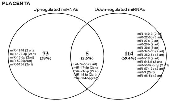 Venn diagram. The most frequently reported miRNAs in the placenta of women with gestational diabetes mellitus are shown. On the left are the up-regulated miRs, and on the right are the down-regulated miRs. At the intersection, miRNAs whose expression is still controversial are shown. The parentheses indicate the number of reports.