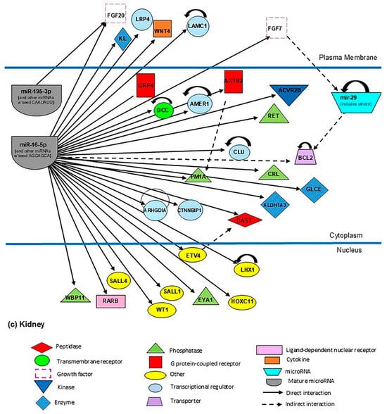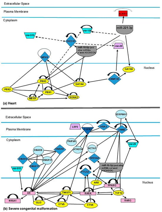 To determine the significance of miRNAs frequently reported in the scientific literature in relation to fetal development, the The networks were generated through the use of QIAGEN IPA (QIAGEN Inc., https://digitalinsights.qiagen.com/IPA). Gene networks were established to intuitively analyze the relationship of miR-16-5p, -126-3p, -185-5p, -195-5p, -222-3p, -518b, and the miR-29 family, which are implicated in the development of the heart, congenital malformations, and kidneys, as shown in Figure 5a–c, respectively. These analyses highlight the biological roles of miR-16-5p, -126-3p, -195-5p, -518b, and the miR-29 family in neonatal development.