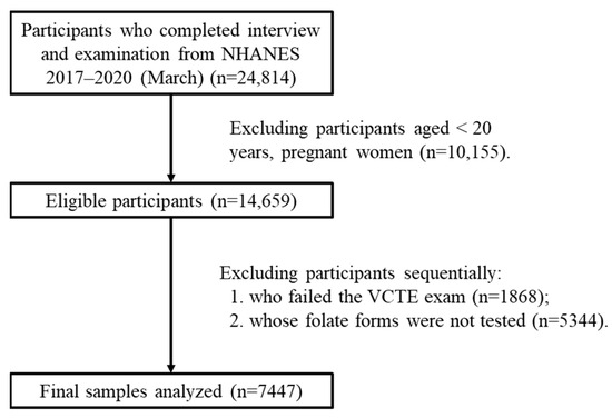 Previous studies exploring the relationship between different serum folate levels and NAFLD as well as liver fibrosis have employed a variety of analytical methods. Our main aim was to increase the sample size. To achieve this, we included participants who had undergone vibration-controlled transient elastography (VCTE) from two cycles of the National Health and Nutrition Examination Survey (NHANES): the 2017–2018 cycle and the 2017–2020 (March) cycle. Afterward, we embarked on an in-depth investigation of the cross-sectional associations. Specifically, we looked at the relationships between different serum folate levels and MAFLD as well as liver fibrosis.
