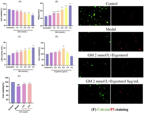 Screening of GM and Erg concentrations. (A): Effect of GM on MDCK cell viability; ** p < 0.01. (B): Effect of GM on NO release in MDCK cells; ** p < 0.01. (C): Effect of GM on LDH release in MDCK cells; ** p < 0.01. (D): Effect of Erg on MDCK cell viability, * p < 0.05, ** p < 0.01. (E): Effect of Erg on GM-induced MDCK cell viability; ## p < 0.01, ** p < 0.01. (F): Calcein/PI staining.