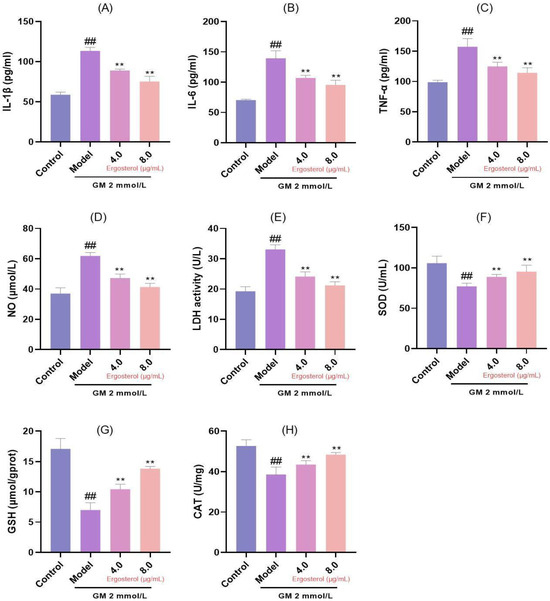 To delve deeper into the mechanisms underlying GM-induced cellular stress, we measured the release of NO and lactate dehydrogenase (LDH), both of which are indicative of inflammation and cellular injury, respectively. The results demonstrated a notable elevation in NO concentrations ranging from 2.0 to 3.0 mmol/L GM (p < 0.01) (Figure 1B), suggesting that higher concentrations of GM elicit a more pronounced inflammatory response. Similarly, LDH release followed a similar pattern, with significant elevations observed at concentrations between 1.0 and 3.0 mmol/L, reaching statistical significance (p < 0.01) (Figure 1C), confirming increased cellular membrane damage. Balancing the need for a robust stress-inducing effect while ensuring sufficient cells survive for analysis, we selected 2.0 mmol/L GM as the optimal induction concentration. This concentration provided a suitable balance between cell viability reduction and inflammatory mediator release, enabling a comprehensive investigation of the subsequent protective effects of ergosterol (Erg).
