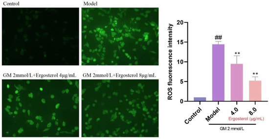 ROS serve as primary drivers of oxidative damage and cellular damage. To assess Erg’s effect on ROS inhibition, we utilized DCFH-DA staining to visualize cytoplasmic ROS levels. GM treatment resulted in a marked increase in ROS production, evident from the enhanced fluorescence intensity (Figure 3). However, Erg pretreatment significantly reduced ROS fluorescence, confirming its role as an effective antioxidant. These finding underscores Erg’s potential as a therapeutic agent in mitigating oxidative stress-related pathologies.