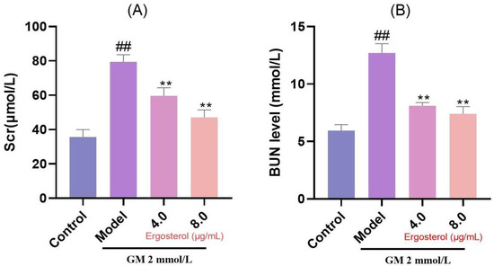 Given the renal tubular origin of MDCK cells, we further investigated Erg’s protective effects against GM-induced nephrotoxicity by measuring indices of renal excretory function, such as Scr and BUN levels. Our results demonstrated significantly increased concentrations of Scr and BUN in MDCK cells treated with GM (Figure 4). However, Erg intervention mitigated these elevations, suggesting its protective effect against GM-induced nephrotoxicity.