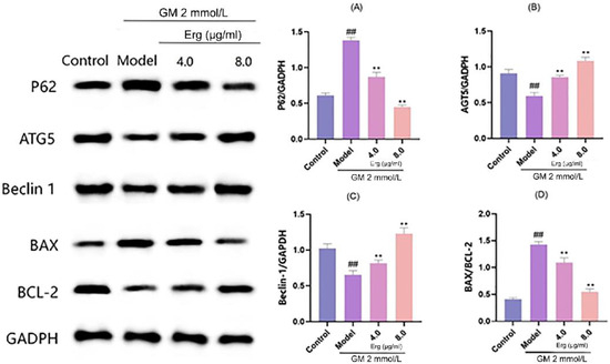 Autophagy is a critical cellular process involved in the degradation and recycling of damaged organelles and proteins, while mitochondrial apoptosis plays a pivotal role in programmed cell death. Western blot analysis revealed that GM treatment significantly upregulated the autophagy substrate P62 and downregulated the key autophagy regulatory proteins ATG5 and Beclin1 (Figure 5). These changes indicate that GM inhibits autophagy, leading to the accumulation of damaged organelles and subsequent cell death. However, Erg treatment reversed these detrimental effects. Specifically, Erg reduced P62 expression while upregulating ATG5 and Beclin1, suggesting the activation of autophagy. This restoration of autophagy may help in clearing damaged organelles and proteins, thereby mitigating cellular stress. Additionally, Erg decreased the BAX/BCL-2 ratio, indicating reduced mitochondrial apoptosis. These findings provide insight into the molecular mechanisms underlying Erg’s protective effects and suggest its potential as a therapeutic agent in modulating autophagy and apoptosis pathways.