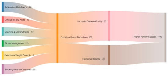 This Sankey diagram illustrates how a number of beneficial therapies, including exercise, stress management, omega-3 fatty acids, and diets high in antioxidants, combine to lessen oxidative stress. Hormonal balance and gamete quality are both improved by this lowering, which eventually increases fertility results.