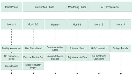 Structured lifestyle counseling that incorporates stress reduction, weight management, limiting alcohol intake, and quitting smoking as part of preconception care has been shown to optimize the reproductive window and improve the likelihood of natural conception [66]. A more integrated and effective model of care can be achieved when fertility doctors partner with dietitians, physical therapists, and mental health specialists. Moreover, implementing a pre-treatment optimization phase that includes nutritional and lifestyle modifications before initiating ART may improve gamete quality and implantation success. For example, pre-treatment weight loss in individuals with obesity has been associated with improved hormonal balance, reduced OS, and higher clinical pregnancy rates (Figure 3 and Figure 4) [67].