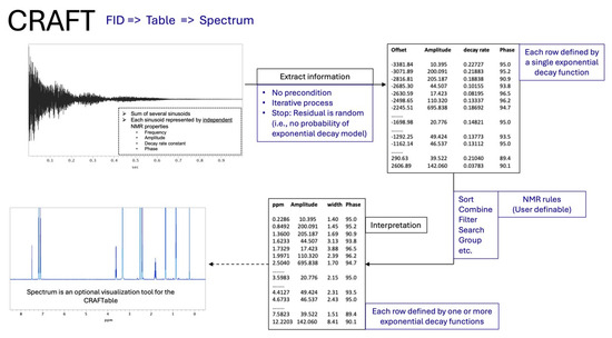 As a simple and efficient alternative, we instead turned to the powerful software tool, CRAFT (Complete Reduction to Amplitude-Frequency Table) [10], which directly analyzes the time domain NMR data (FID) with no additional manipulation or data treatment, and presents the content in a spreadsheet format, including the amplitude for quantitation, as opposed to traditionally analyzed frequency domain spectra (Figure 1).