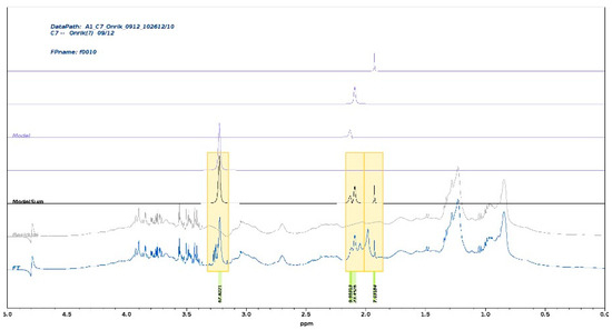 For conventional data processing to produce frequency domain data for untargeted multivariate statistical analysis, the usual, standard protocol was applied, readily available in the MestreNova software. Apodization, phase correction, baseline correction, calibration, global and local peak alignment were applied as described [23,27]. The alpha-glucose alpha-H doublet was set to 5.233 ppm as reference for calibration [28]. Conventional NMR spectral data processing and visualization were conducted using MNova, up to v.14.3 (MestreLab Research S.L., Santiago de Compostela, Spain). We wish to point out again that the CRAFT protocol avoids all these steps, uses only and exclusively the native time domain data (FID), and extracts the relevant spectral parameters directly.