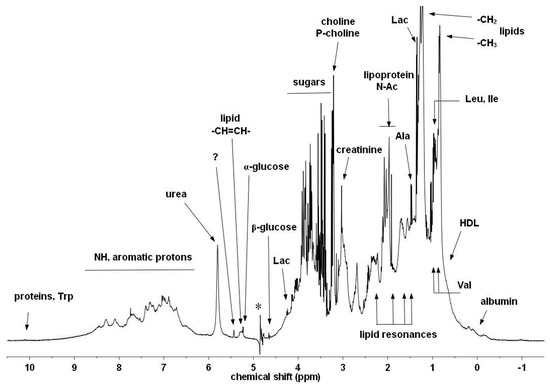 Typical 1H-NMR spectrum of horse serum. Some of the characteristic metabolites and other components are denoted [29] (with permission). The asterisk labels the residual artefact of the suppressed water signal.