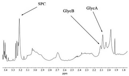 An expanded section of a randomly selected full spectrum from the set of 40 samples is shown in Figure 4. The three peaks of interest to us, which are the biomarkers for inflammation (SPC, GycB, GlycA), are annotated.