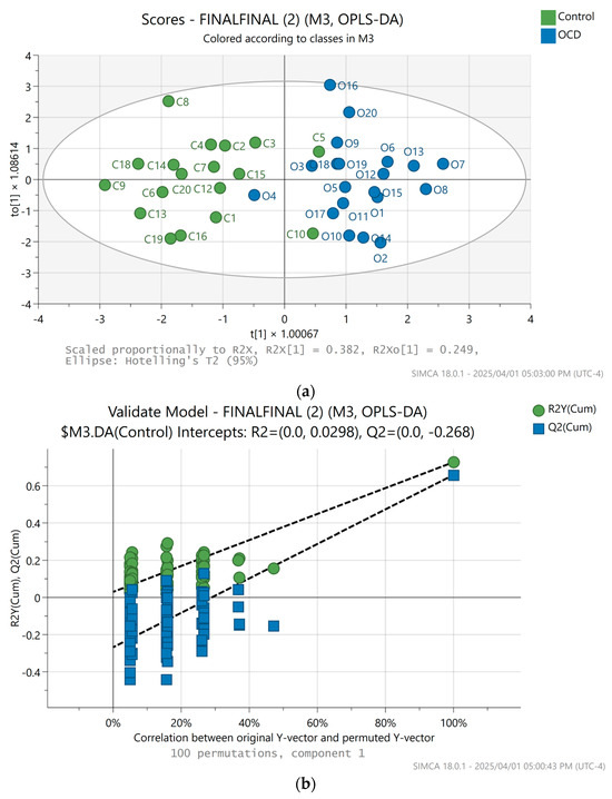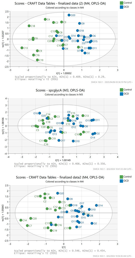 Multivariate statistical analysis was done in SIMCA (v.16, Sartorius/Umetrics, Umea, Sweden). In preparation for the multivariate analysis of the conventional data, the processed spectra were exported to Excel, and the full set was saved as a csv output file, which is accepted in SIMCA. Various models were calculated and carefully validated, where the O-PLS-DA models are most informative [6]. Distinct clustering on a scores scatter plot is indicative of differences between OCD and control groups. Validity of the statistical models was tested using the R2 and Q2 values, R2 representing the goodness of fit and Q2 representing the predictability [6]. Cross-validation is completed by removing data elements from the model and re-inserting them to be compared to the R2 and Q2 values of the original model, a standard procedure in the SIMCA software. The original model R2 and Q2 values should be higher than the cross-validated R2 and Q2 values [6]. All data presented here were mean centered, and univariate scaling was used.