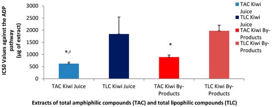 Anti-platelet effects of TAC and TLC extracts from kiwifruit juice and by-products against the thrombotic pathway of a standard platelet agonist (ADP). Results are expressed as IC50 values (half maximum inhibitory activity) against the ADP-induced aggregation of PRP. * Indicates a statistically significant difference (p < 0.05) of the anti-ADP effects of TACs compared to those of their TLCs, # indicates a statistically significant difference (p < 0.05) of the anti-ADP effects of TACs from the juice compared to that of the TACs from the by-products. (TAC = total amphiphilic content; TLC = total lipophilic content; PAF = platelet-activating factor; PRP = plasma rich platelets).