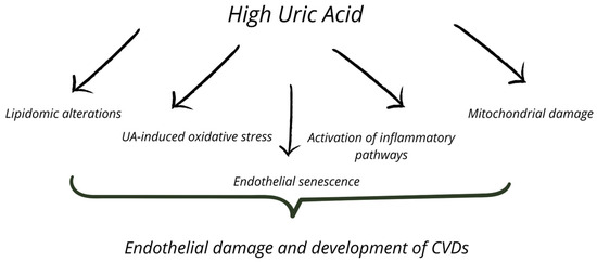 A possible common factor linking the negative effects of UA and the development of CVDs is endothelial damage via cellular senescence. UA may indirectly affect endothelial dysfunction via XO or directly impact vascular endothelial cell senescence.