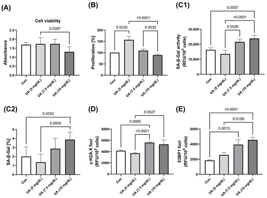 Effect of varying concentrations of exogenous UA on HUVEC (A) viability, (B) proliferation, and senescence markers. Quantification (C1) and qualification (C2) of SA-β-Gal activity and the expression of (D) γ-H2A.X and (E) 53BP1. The data are presented as mean ± SD.